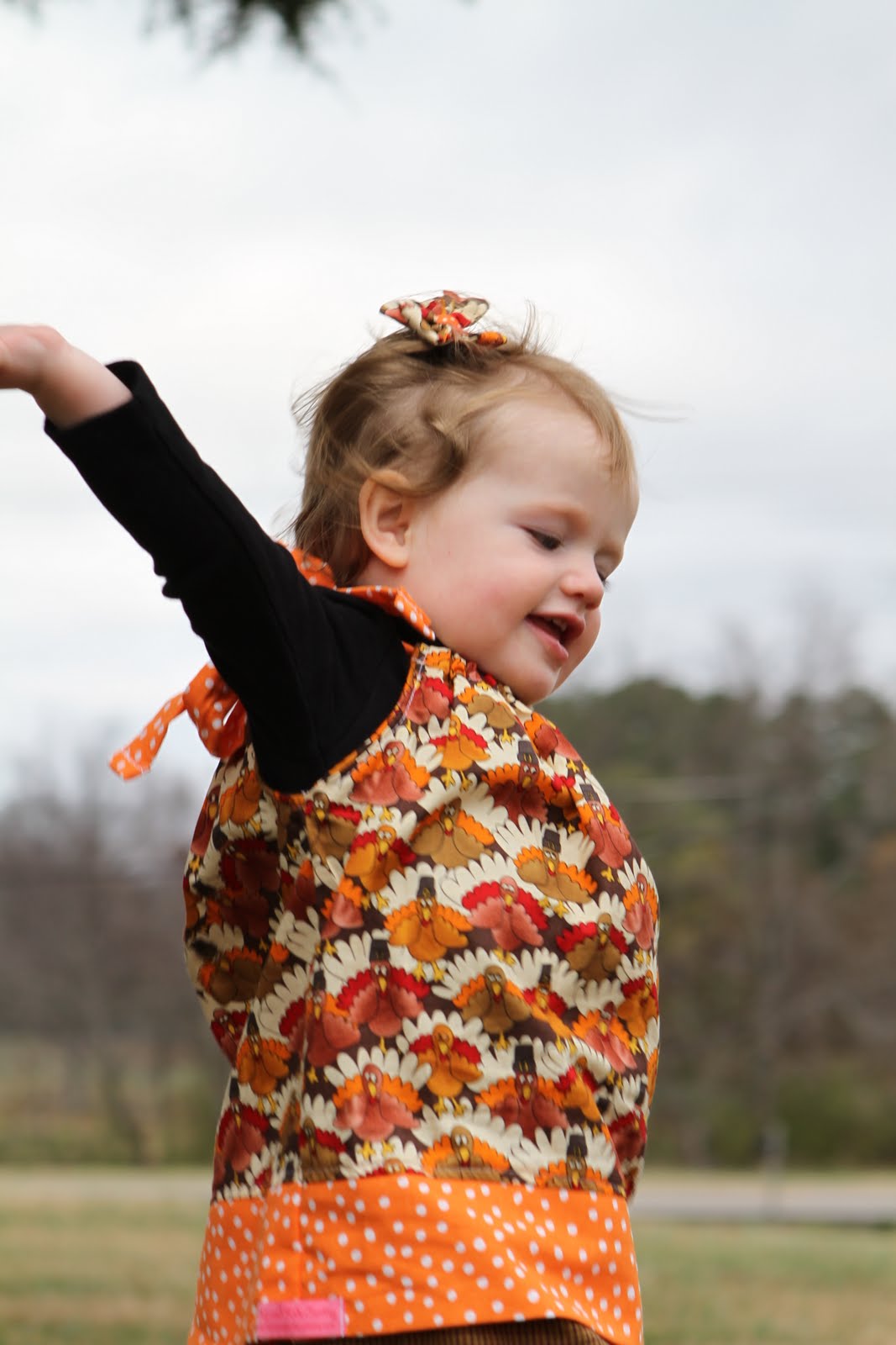 Lilli was up early Thanksgiving morning....I think once she saw us there in the room she was just UP and daylight savings time hasn't really helped us sleep in any recently. I got her this cute little Thanksgiving outfit off of Etsy. I think she should at least be able to wear the top again next year with different pants.